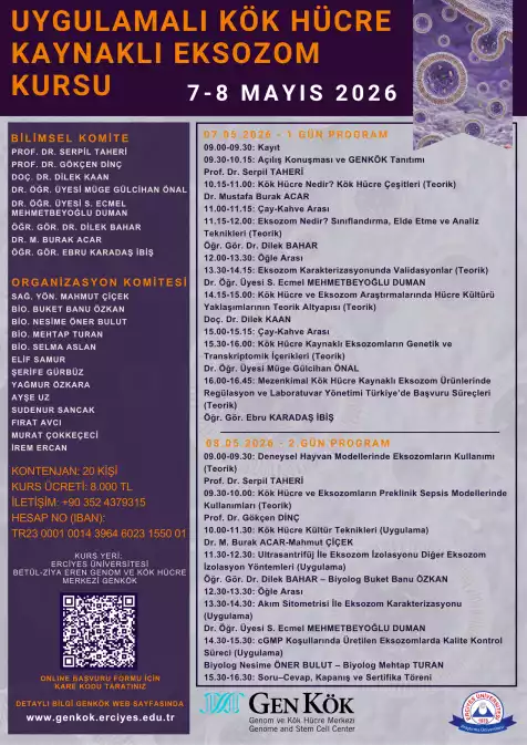 GENKÖK olarak, 07-08 Mayıs 2026 tarihlerinde Uygulamalı Kök Hücre Kaynaklı Eksozom Kursu düzenliyoruz!