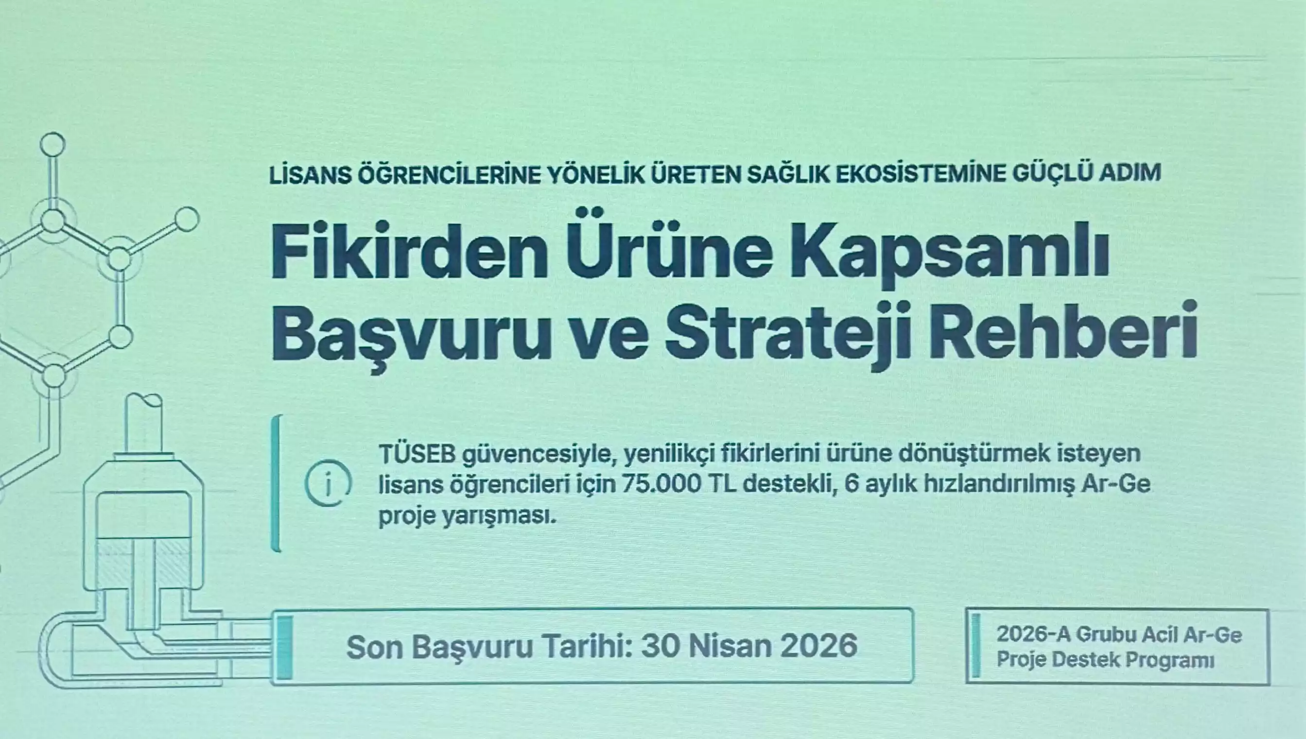 TÜSEB tarafından yürütülen A1 Ar-Ge Proje Destek Programı kapsamında, lisans öğrencilerine yönelik bilgilendirme toplantısı GENKÖK’te gerçekleştirildi. Toplantı, Araştırma Dekanlığı’ndan Öğr. Gör. Dr. Bayram Karakullukçu’nun sunumuyla yapıldı.